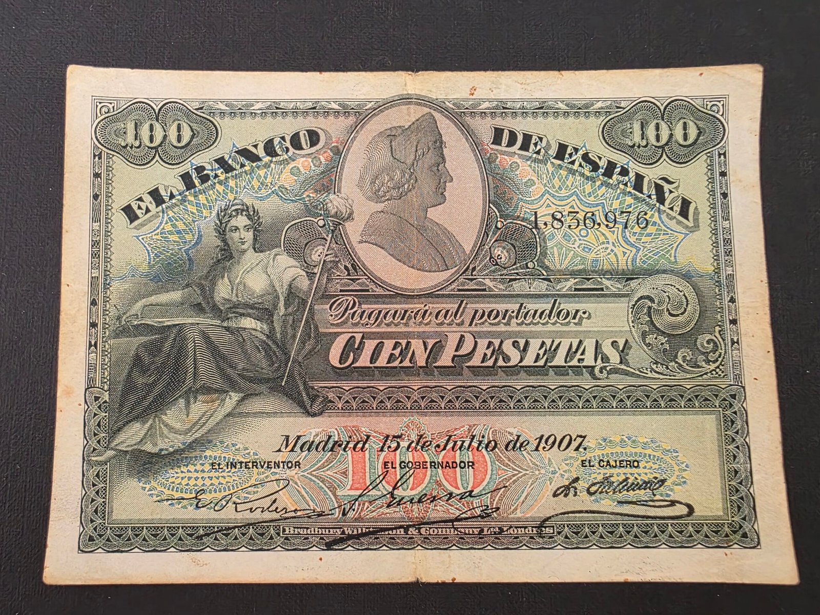 Billete de 100 pesetas del 15 de julio de 1907 alegorías. Billete sin serie pick 64a